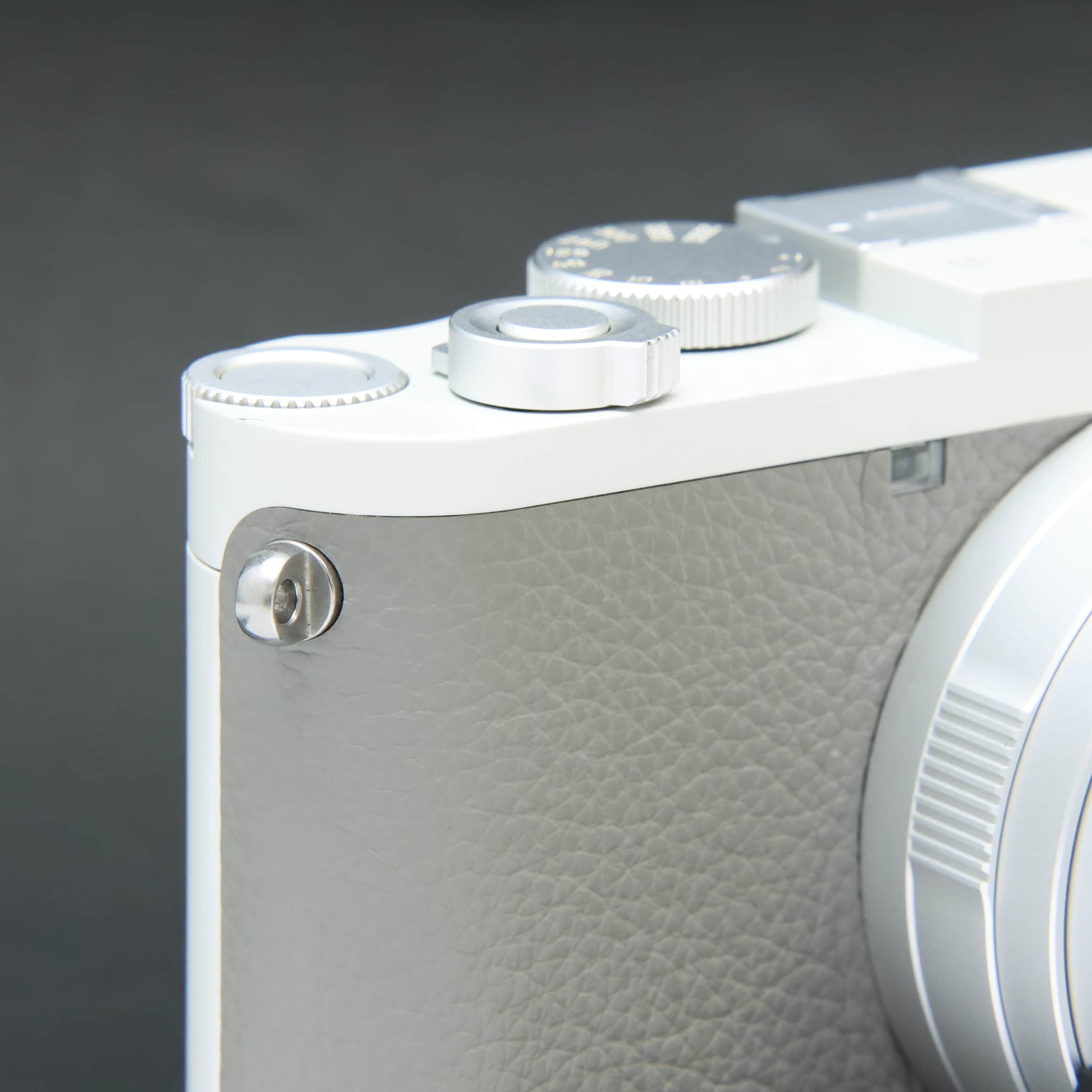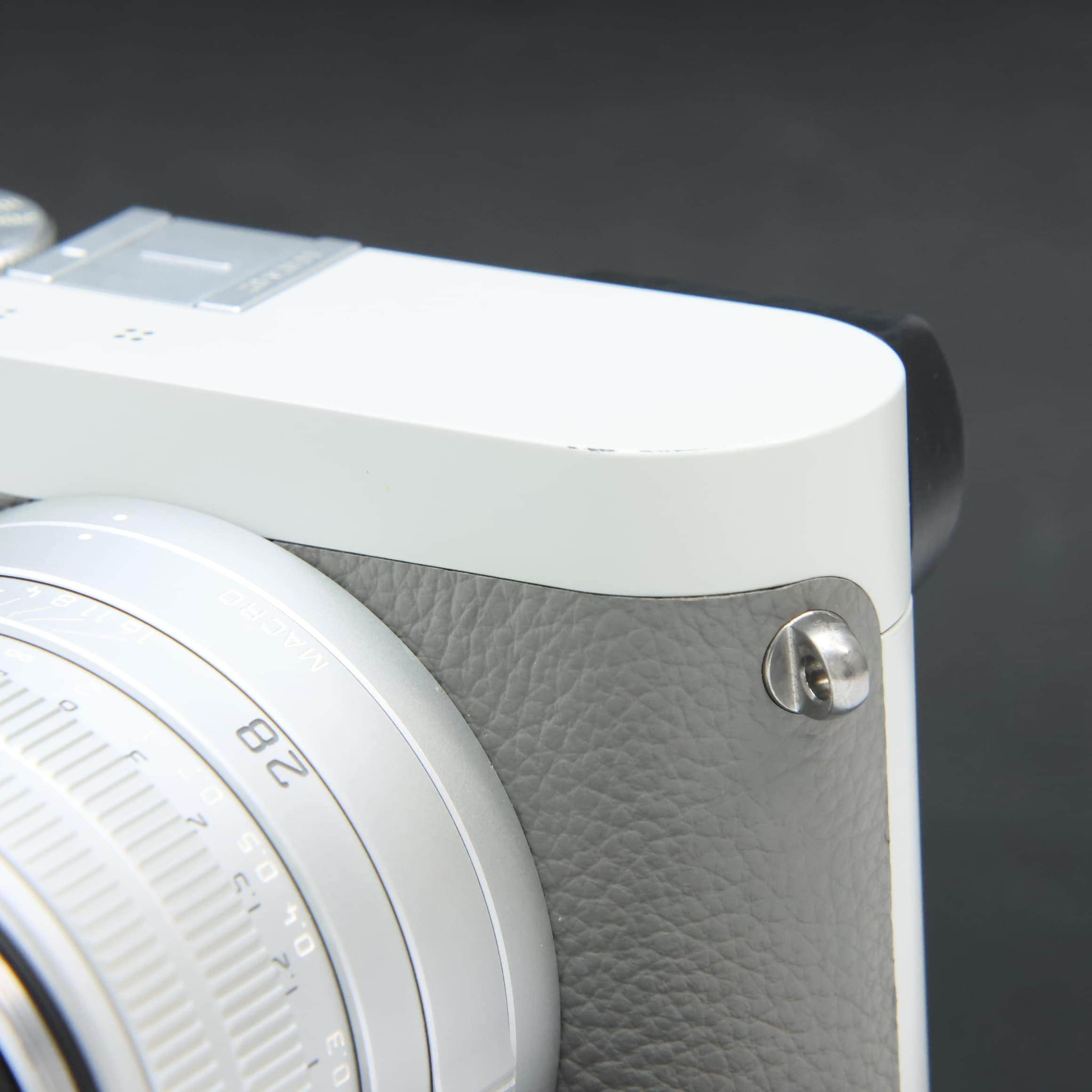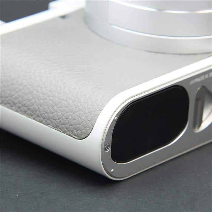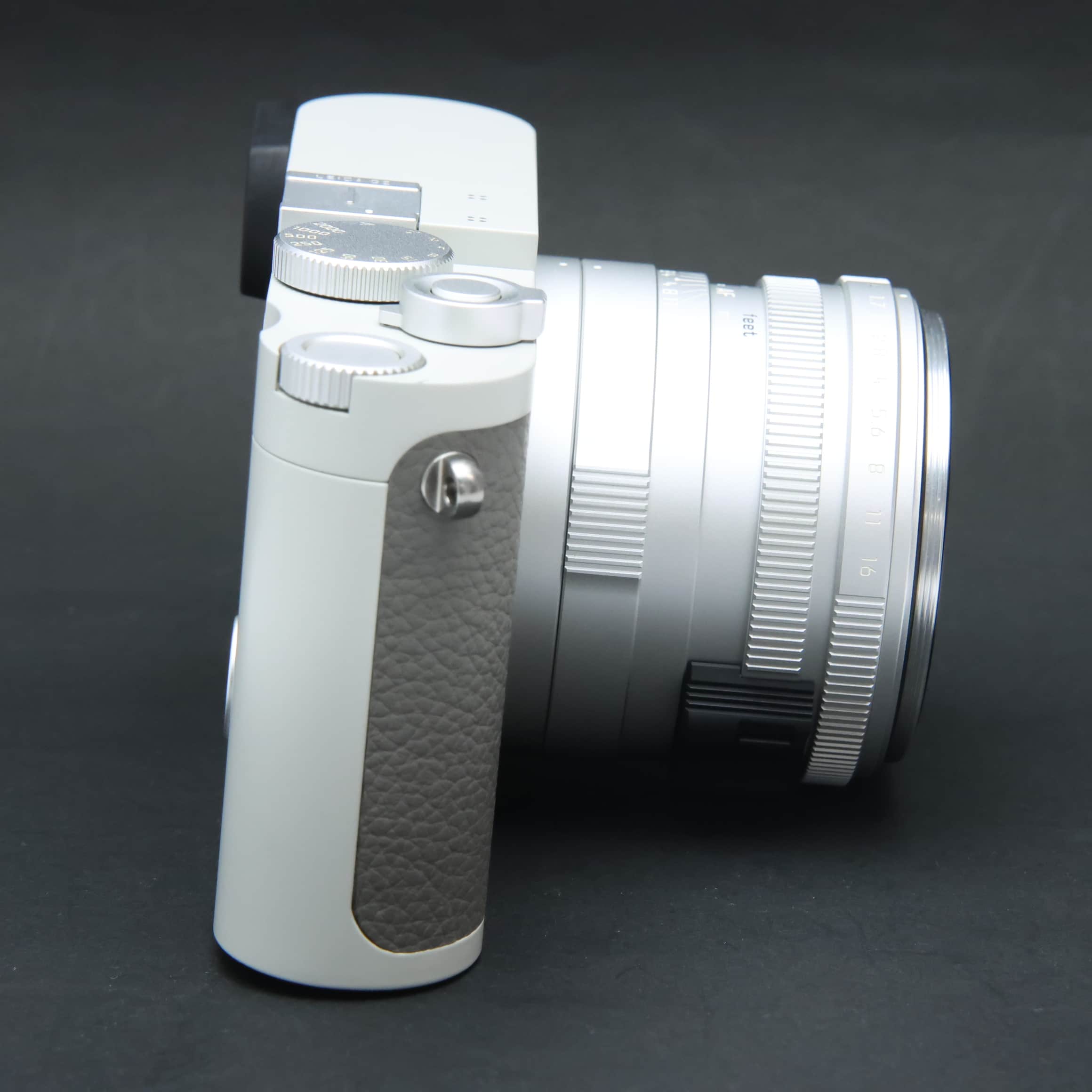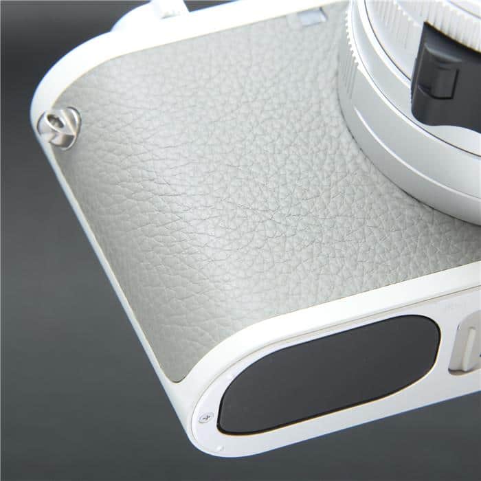 自然な風合いの上質なグレーのカウハイドレザーと、ライトグレーのラッカー仕上げを施したレンズとケースが特徴で、ライカの赤いロゴマークは敢えて配されていません。