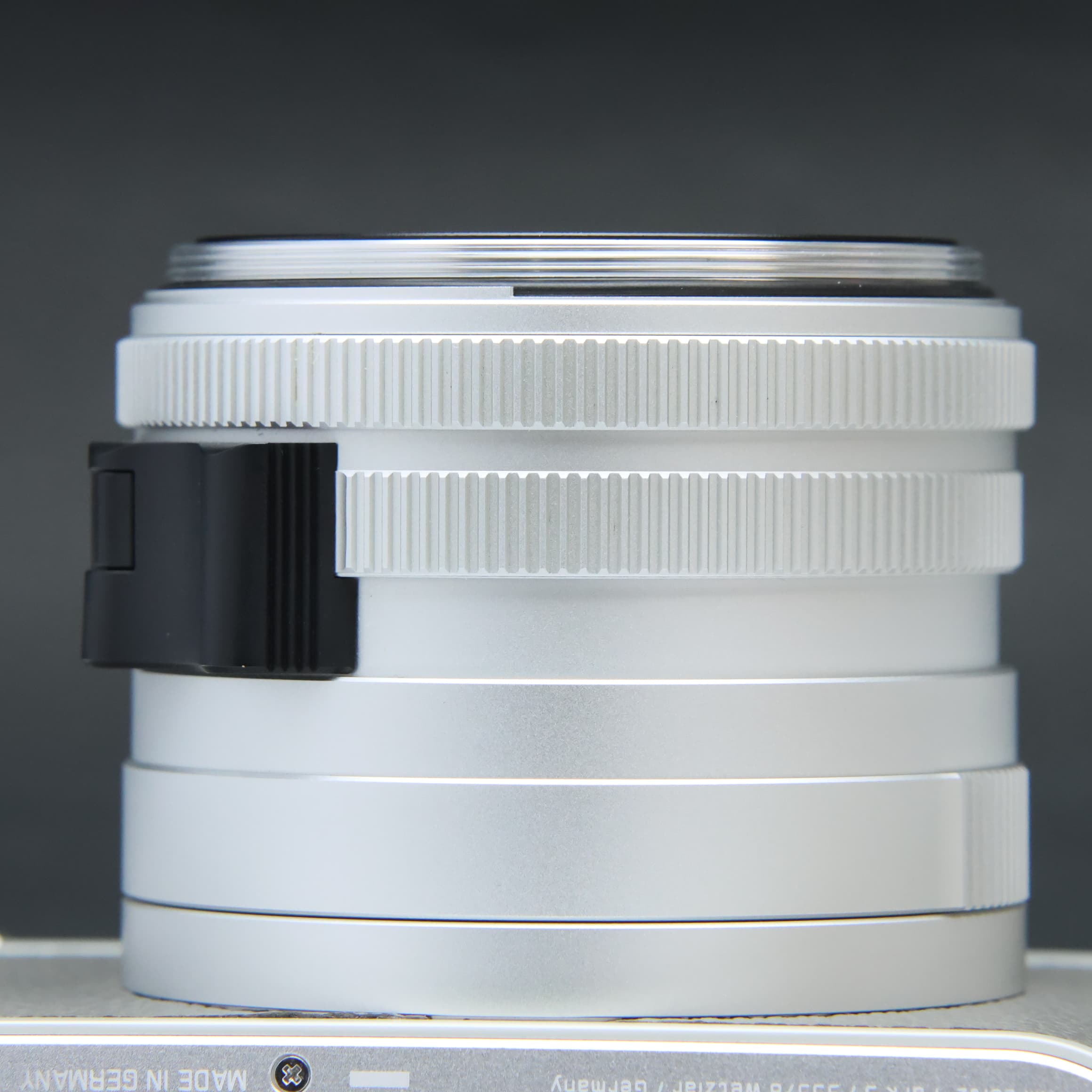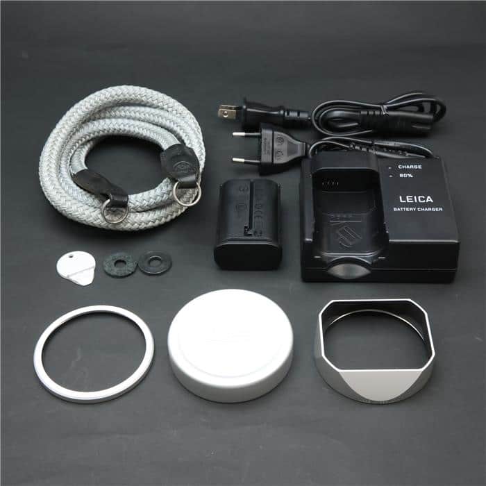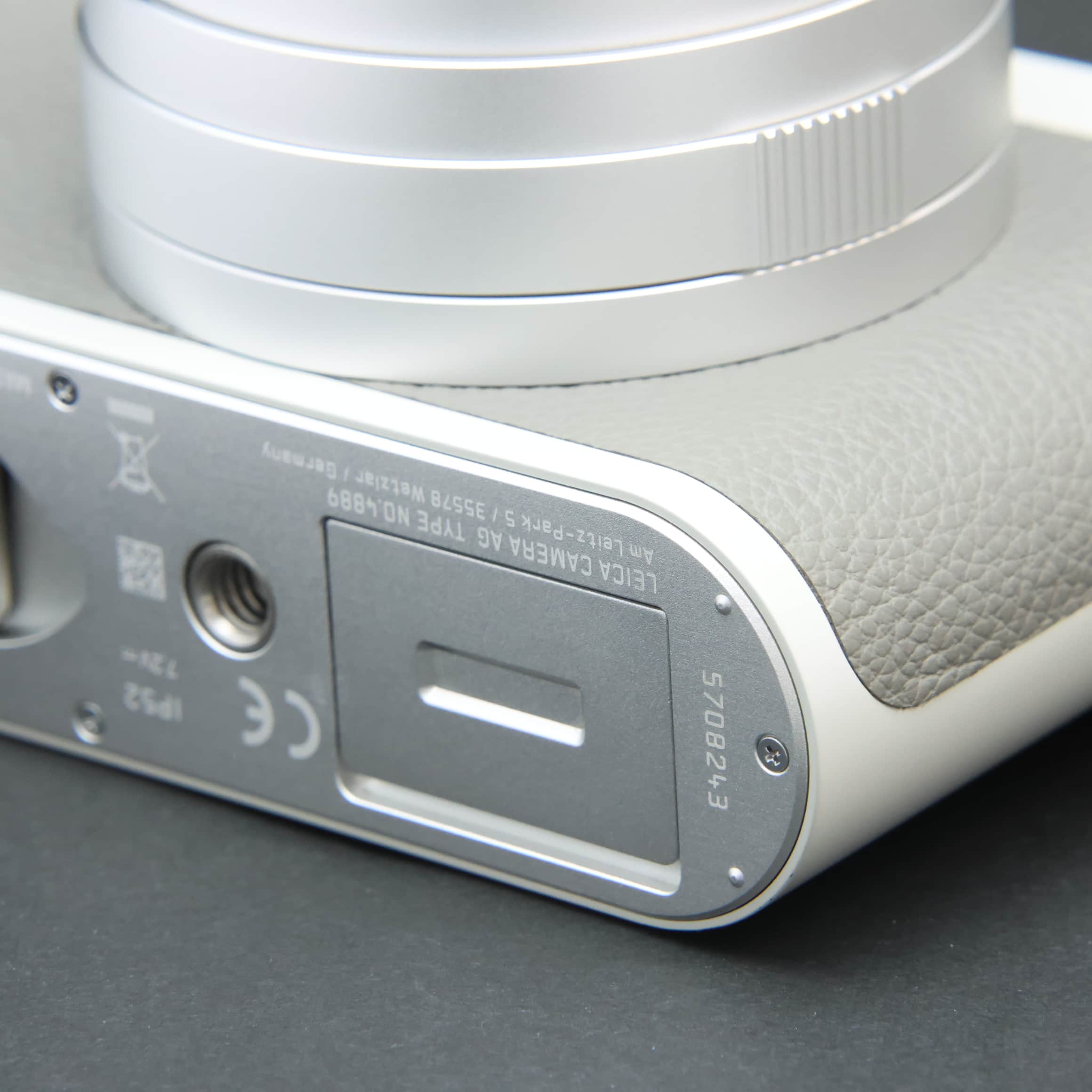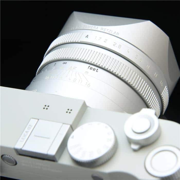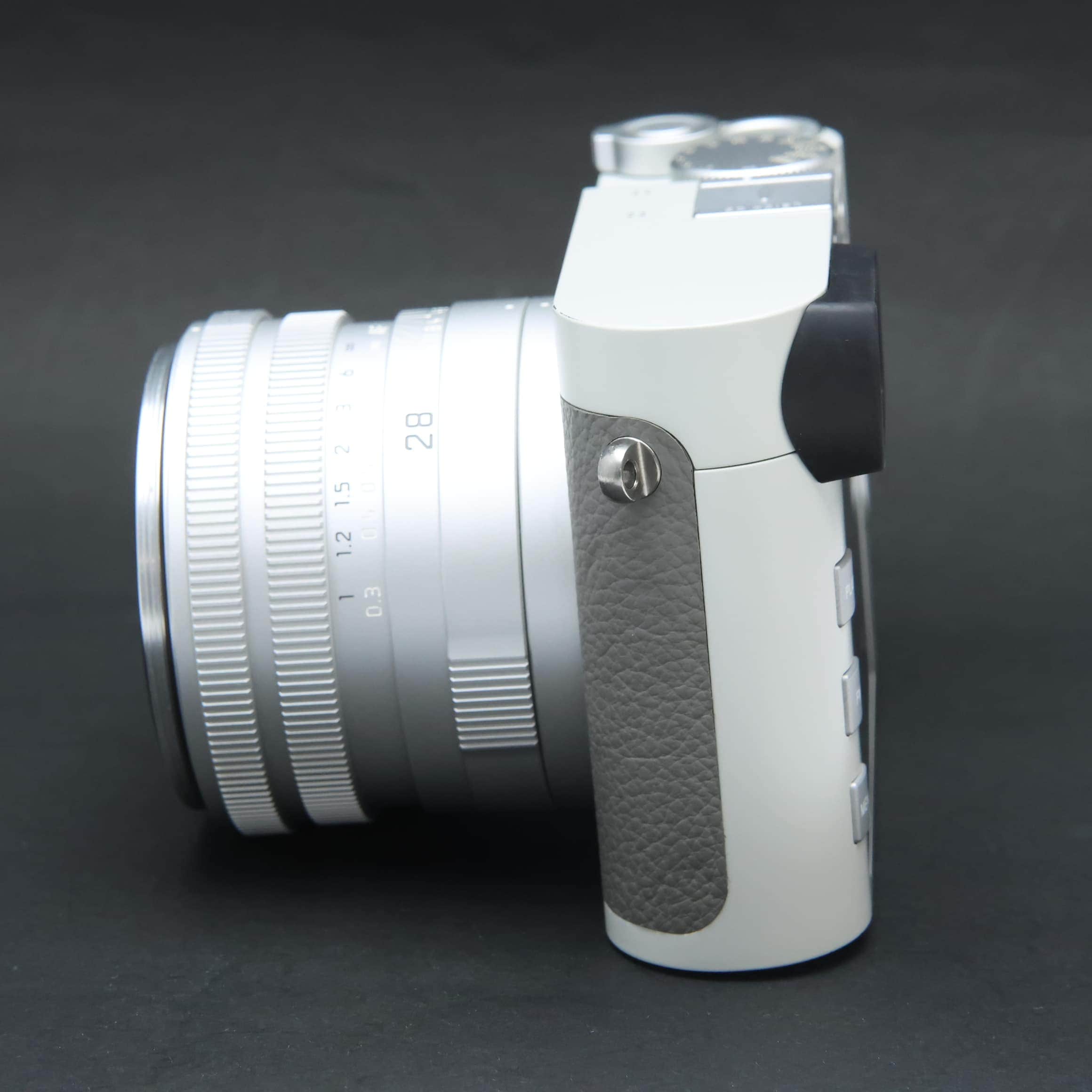 自然な風合いの上質なグレーのカウハイドレザーと、ライトグレーのラッカー仕上げを施したレンズとケースが特徴で、ライカの赤いロゴマークは敢えて配されていません。