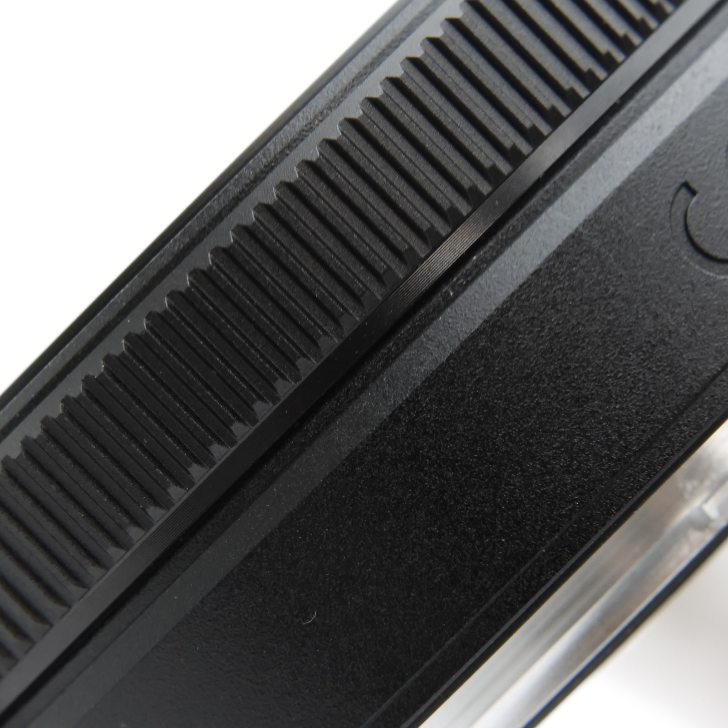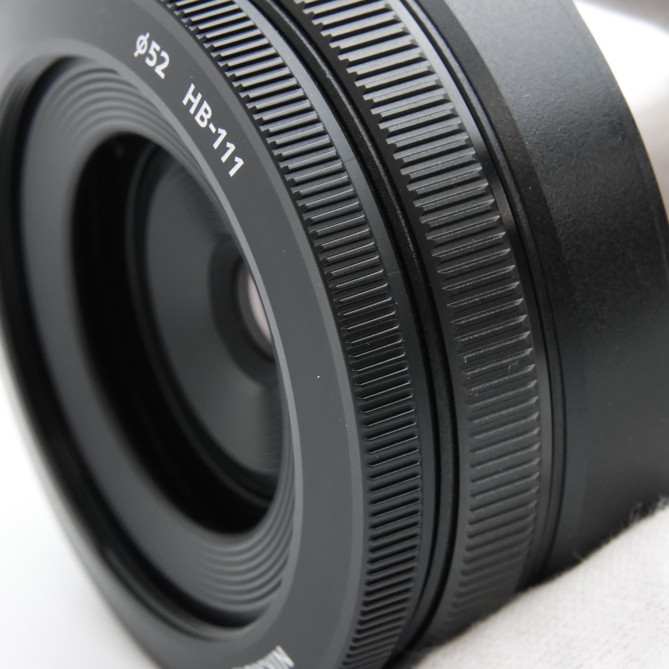 専用のフードは鏡筒と一体感のあるデザイン。ボディーの薄さを維持しつつ繰り出し部分の保護ができ、さらにφ52mmのフィルターを取り付け可能です。かぶせ式レンズキャップは、レンズフードを着けたままでも装着できます。