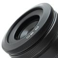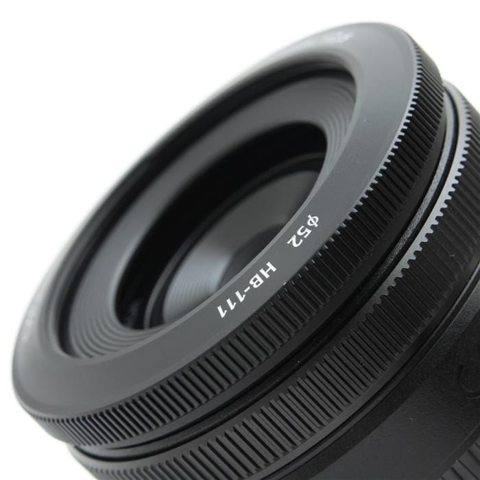 専用のフードは鏡筒と一体感のあるデザイン。ボディーの薄さを維持しつつ繰り出し部分の保護ができ、さらにφ52mmのフィルターを取り付け可能です。かぶせ式レンズキャップは、レンズフードを着けたままでも装着できます。